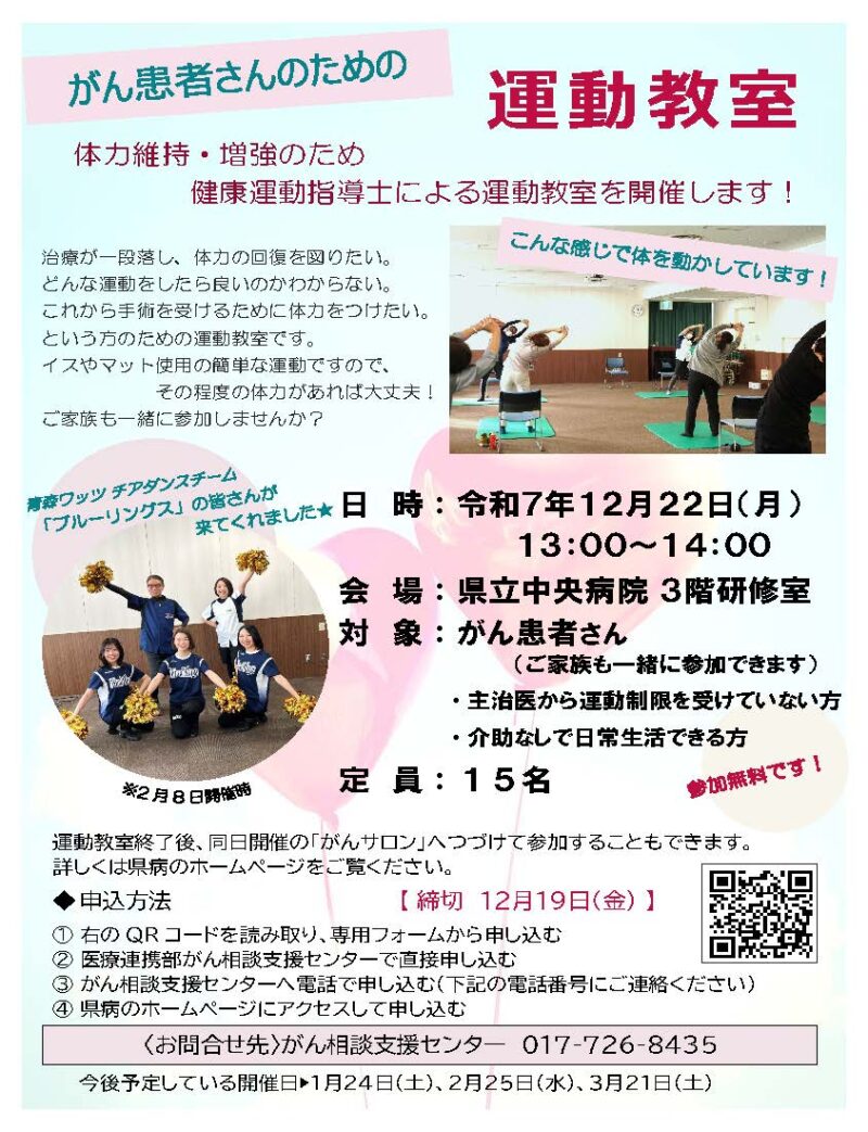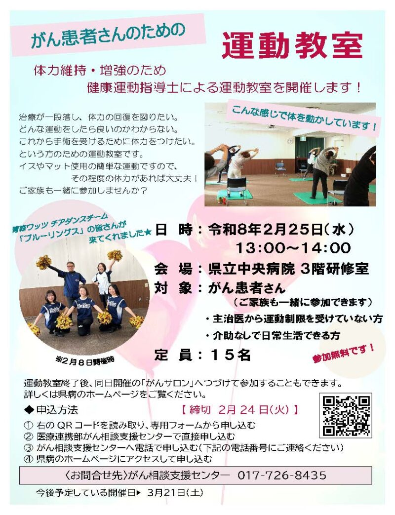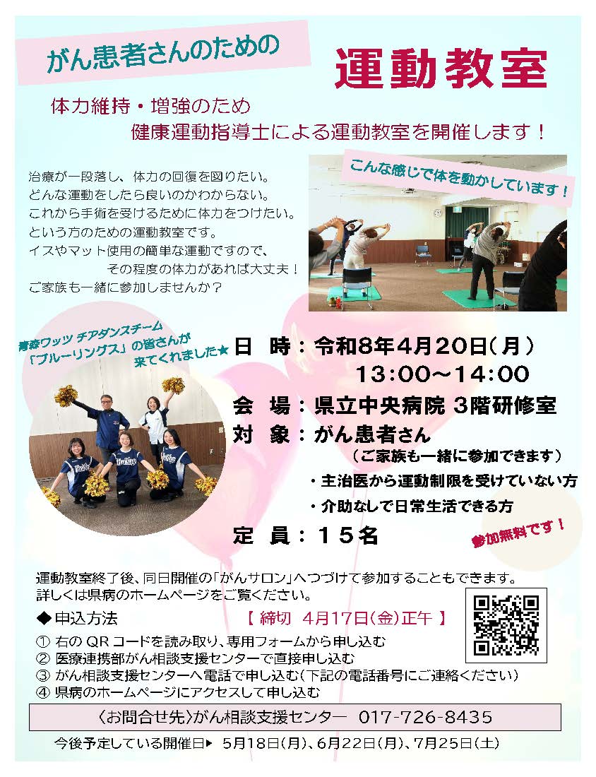 | 対象 | がん患者さん (他院で治療された患者さんやご家族の方もご参加いただけます。) ・主治医から運動制限を受けていない方 ・介助なしで日常生活できる方 |