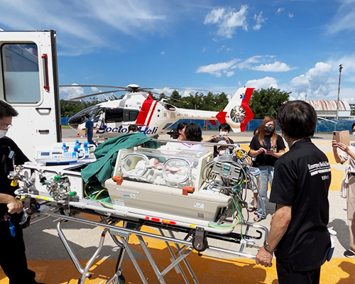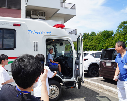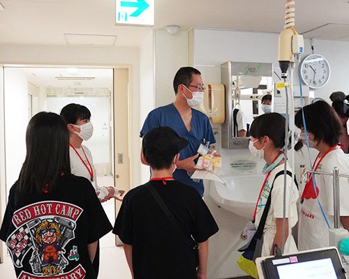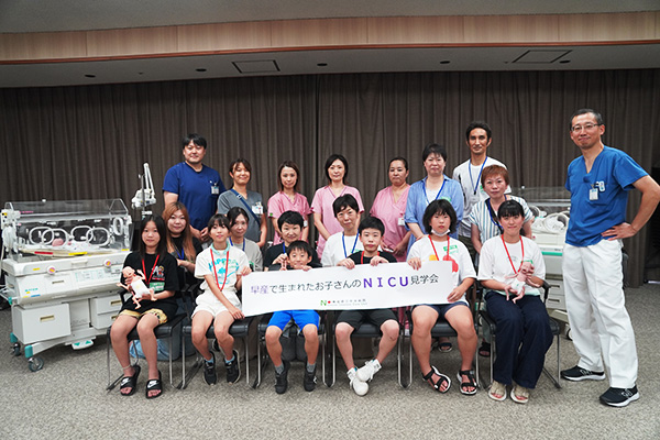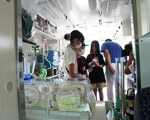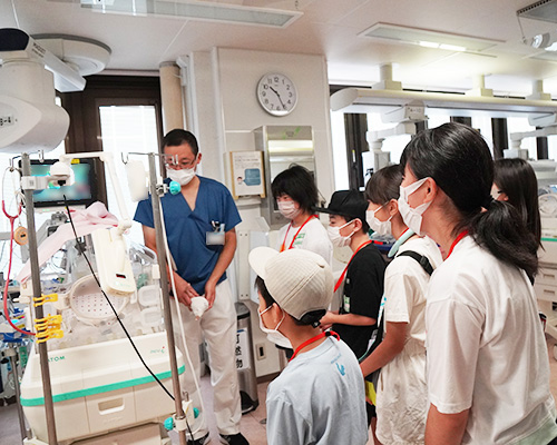 夏休み中の8月18日(月)に、当院のNICUで生まれた子どもたちを対象にNICU見学会を行いました。この日参加したのは6組の親子で、新生児科 池田部長とともに、NICU病棟、ドクターカー、ドクターヘリを見学、また、早産児のケア・治療の疑似体験をしました。