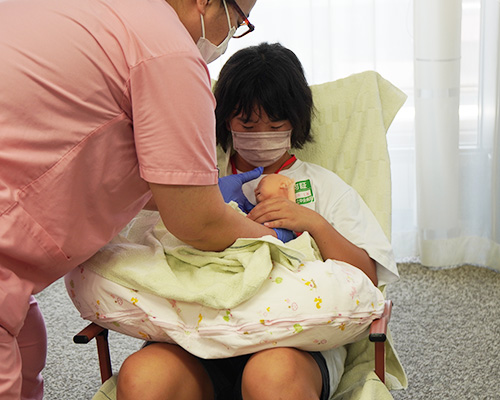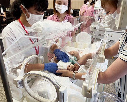 参加した子供たちが新生児期に実際に受けたケア、治療(カンガルーケア、おむつ交換、新生児蘇生、静脈ラインの確保など)を体験しました。