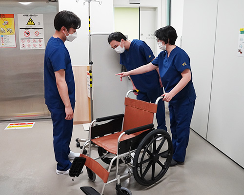 学校で習う撮像技術だけでなく、MRI装置への磁性体吸着体験を行っています。MRI対応の車椅子や点滴台を用いた金属の持ち込みの危険性、安全管理の重要性についても学習します。
