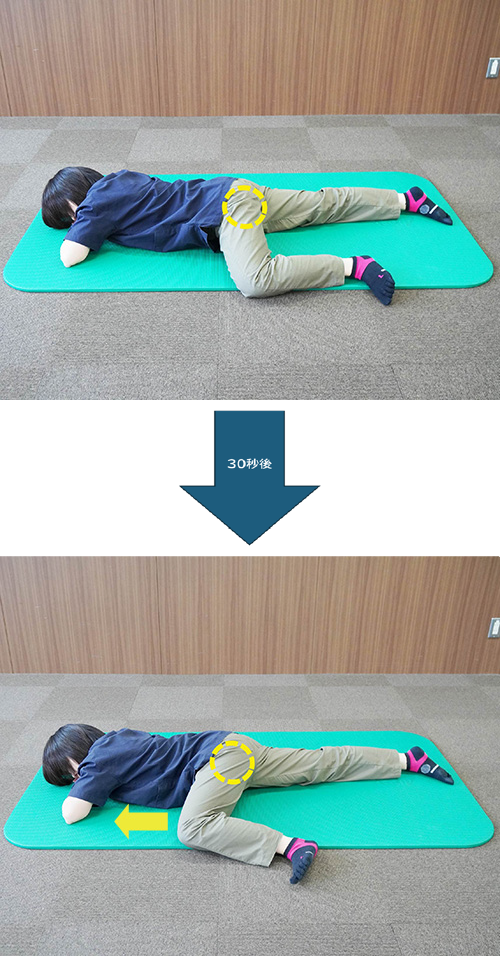 - 30秒程度伸ばしてから、できる範囲で膝をさらに曲げ、30秒程度伸ばします。