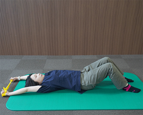 - 肩幅の位置でタオルやゴムバンドを持ちます。