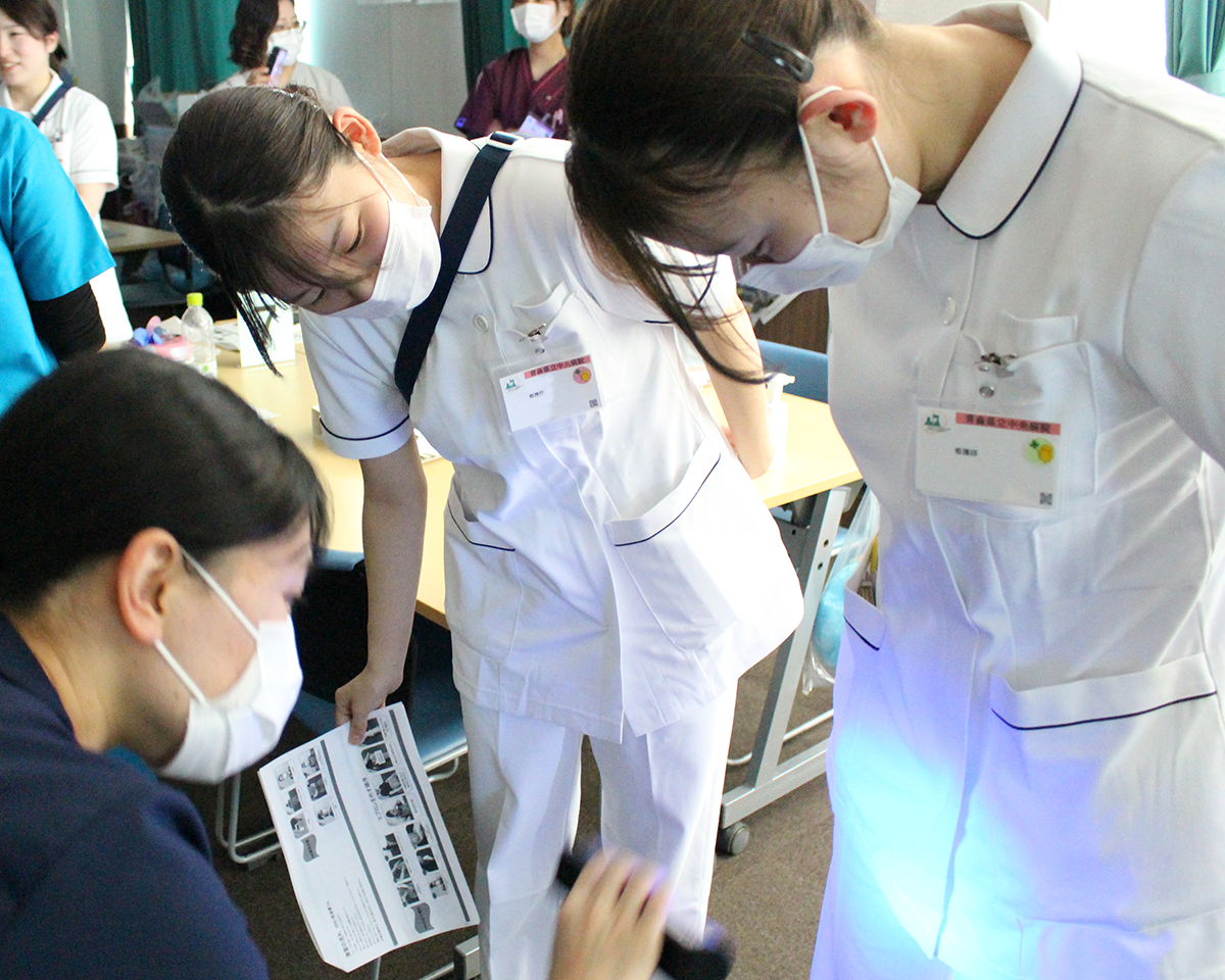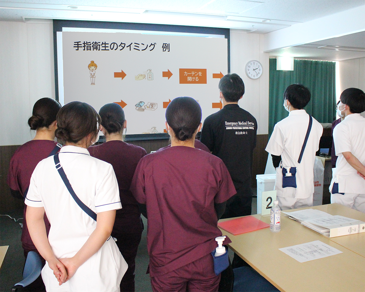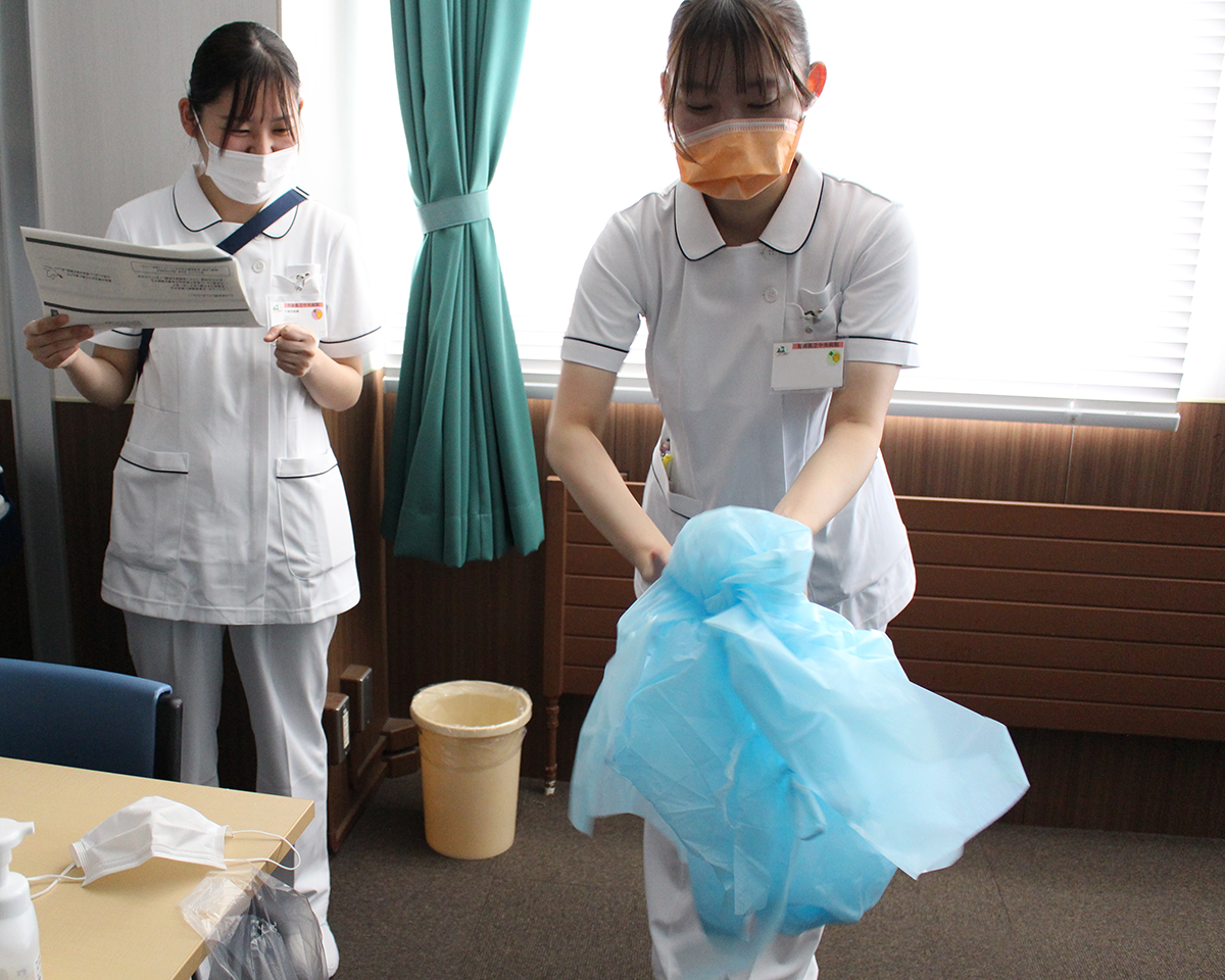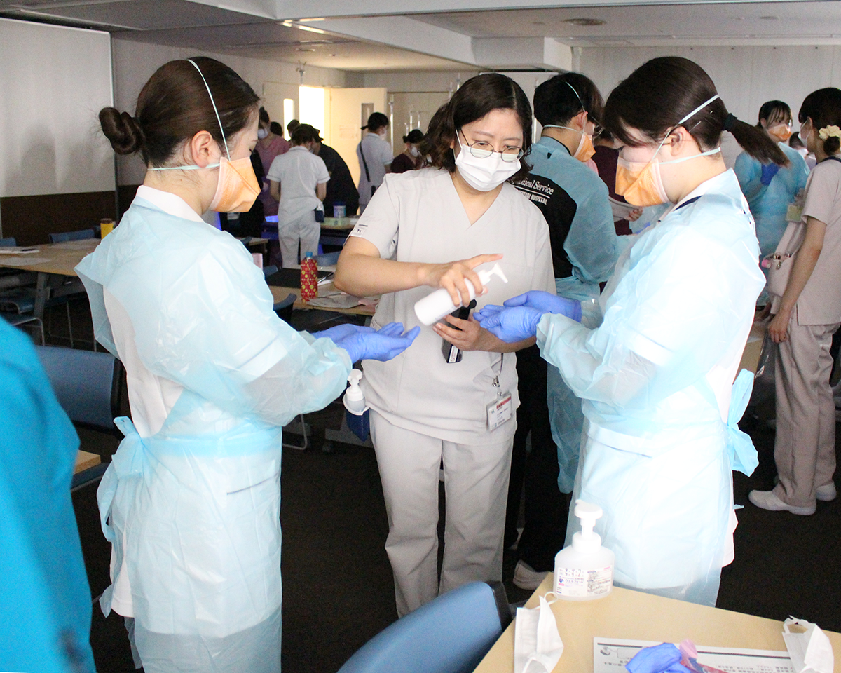 研修では、正しい手指消毒の仕方から、手袋、マスク、ゴーグル、エプロン等の正しい着脱方法を学び、患者さんと自分自身を守るため、日頃から適切な感染対策を確実に行うことが大切であると学び、実感していました。